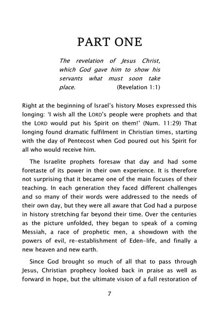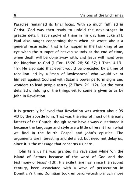 John tells us he was granted his revelation while ‘on the island of Patmos because of the word of God and the testimony of Jesus’. The visions are often quite complex, but fortunately their central message can be grasped without overdue attention to the details, fascinating though these may be. Here we catch the full sweep of the message, for if we start by concentrating on the detail we may fail to see the wood for the trees and end with strange interpretations — like many that have been drawn from this book and have plagued the Church down the centuries.